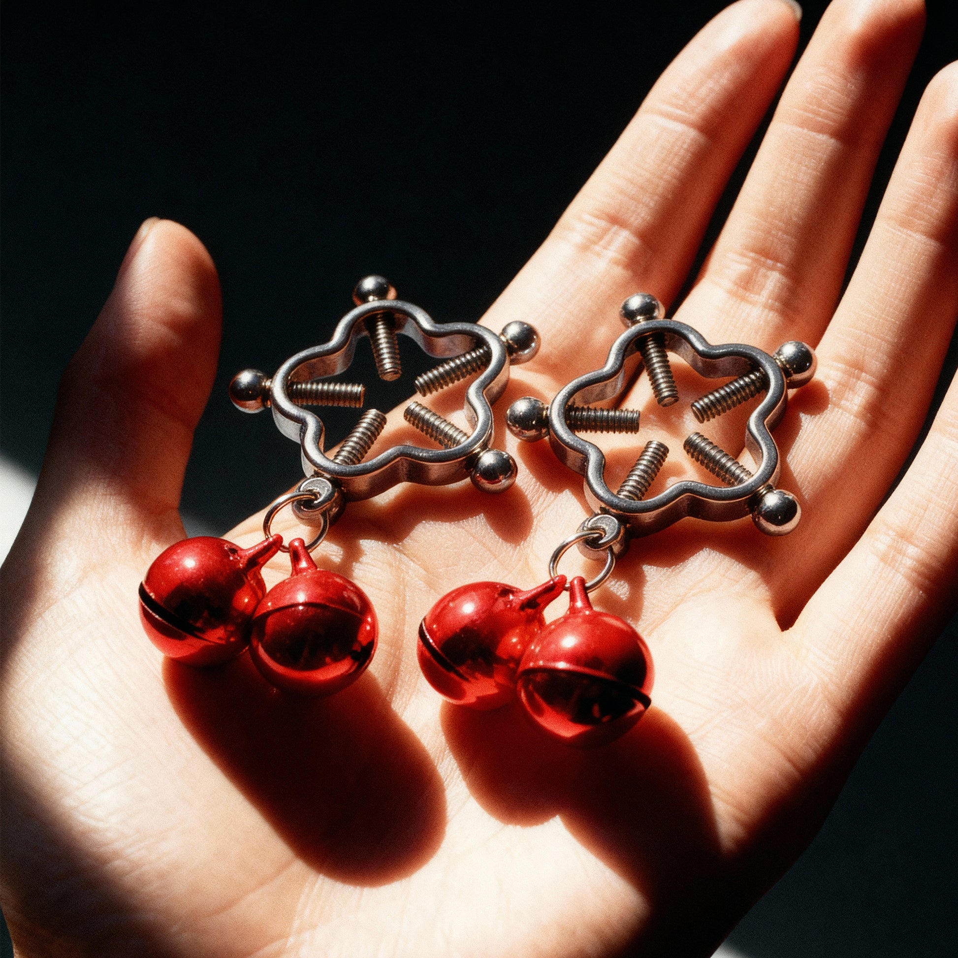 Playful, daring, and just a little wicked, the Berry Nipple Clips turn foreplay into an art form. Designed with an elegant star-shaped clamp and rounded corners, each clip features multiple adjustment points for personalized pressure and comfort. Dangling below, glossy red cherry-like bells add a deliciously visual and audible tease with every movement. Whether you’re looking to explore light BDSM or simply add a touch of playful restraint to your routine, these clips blend beauty and bite in perfect balance. Sensual, musical, and irresistibly juicy, Berry Nipple Clips are your invitation to turn up the heat and make your body sing.
