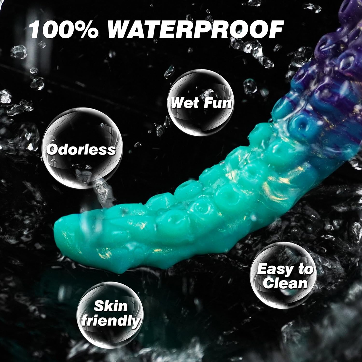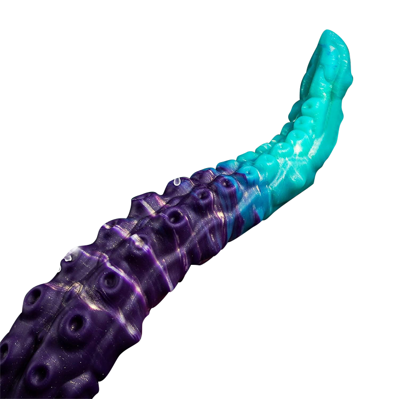Meet TentacleZaurus, a hypnotic, oceanic-like fantasy brought to life for those who dare to explore beyond the ordinary. With twisting, undulating texture, this alien-inspired masterpiece takes you deep into the unknown, offering waves of pleasure that rise and crash with every movement. Its realistic suction cup details and tapered tip deliver targeted stimulation to your G-spot or P-spot, while the liquid silicone body provides a luxurious, silky feel that bends just enough to follow your every motion. The vibrant gradient of blue-green and purple, accented with fine red details, gives TentacleZaurus a mesmerizing look worthy of your private collection.